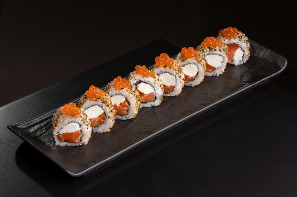 Водоросли нори, японский рис для суши, сыр творожный сливочный , лосось , специя фурикакэ .