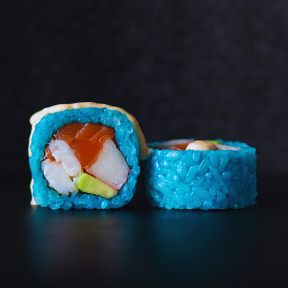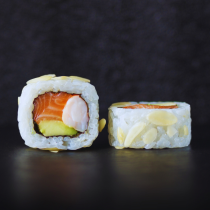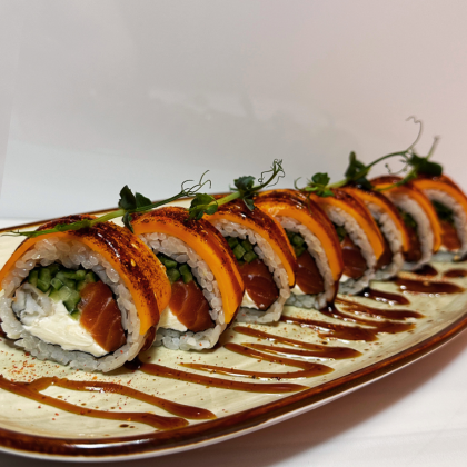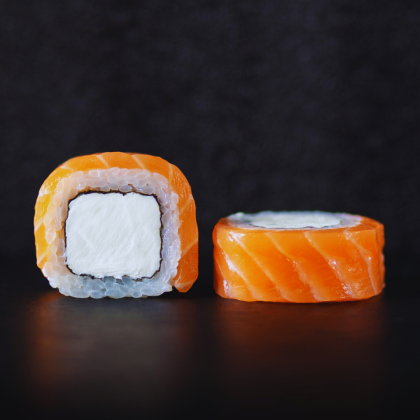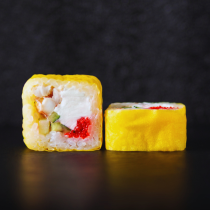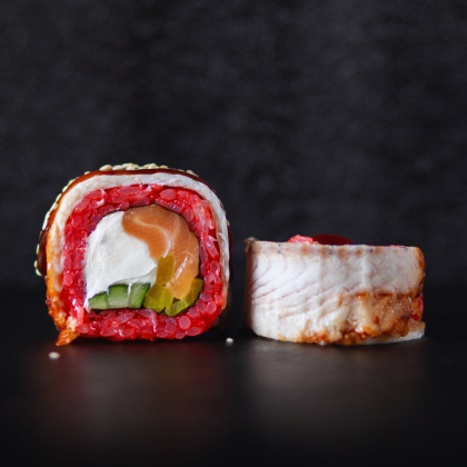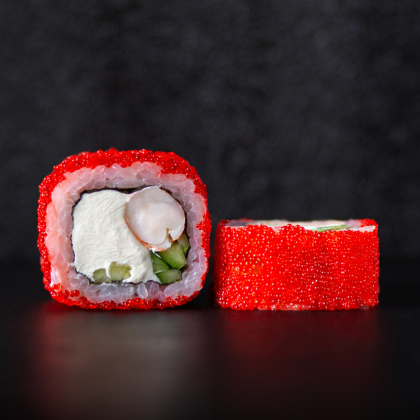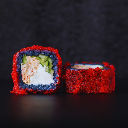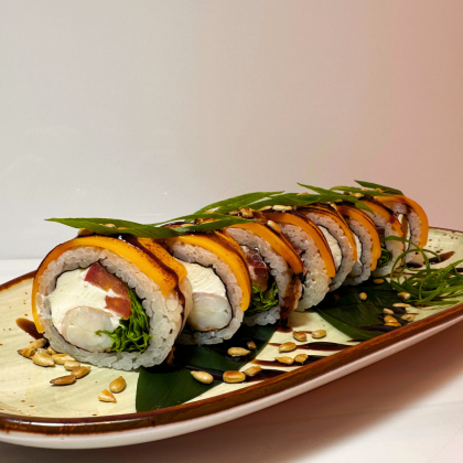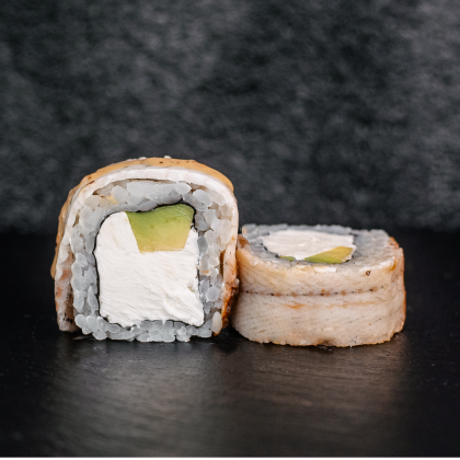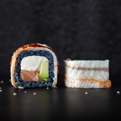 Водоросли нори, рис для суши, сыр творожный сливочный, лосось, паста снежный краба, огурец, соус унаги, семена кунжута.