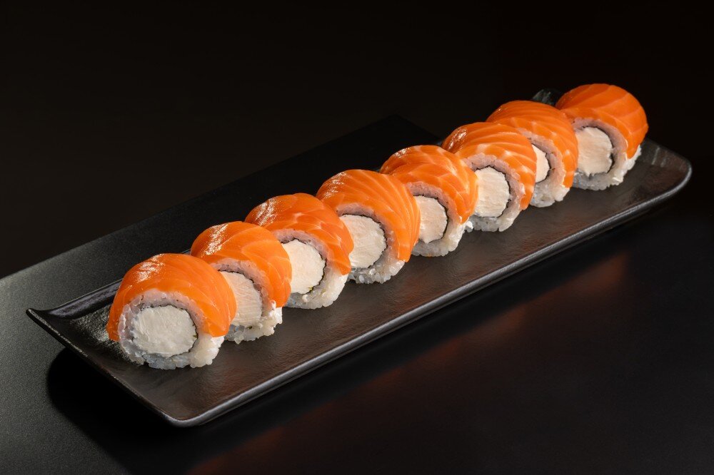 Водоросли нори, японский рис для суши, сыр творожный сливочный , лосось .