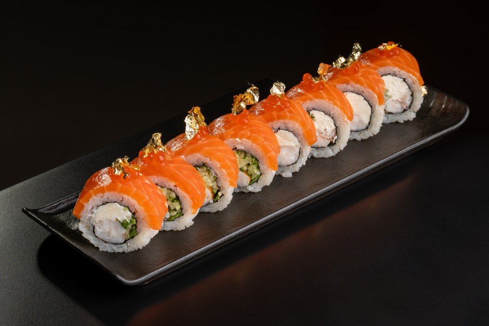 Водоросли нори, японский рис для суши, сыр творожный сливочный , креветка королевская , огурец , лосось .
