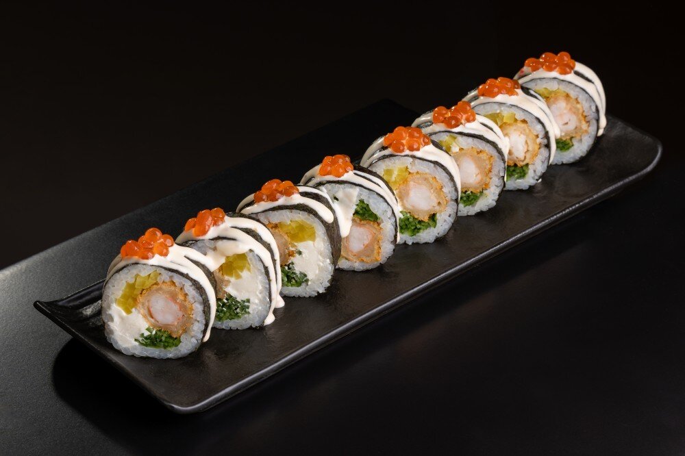 Водоросли нори, японский рис для суши, сыр творожный сливочный, креветка королевская в темуре , огурец, такуан , сливочно - кунжутный соус .
