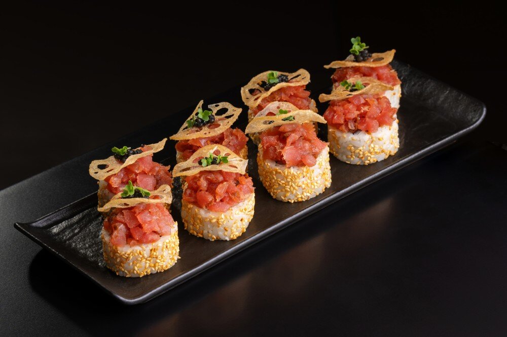 Водоросли нори, японский рис для суши, сыр творожный сливочный , огурец , тунец еллоуфин ,томаты конфи , соус спайси , соус от шефа ,кунжут ким чи, криспи корень лотоса .